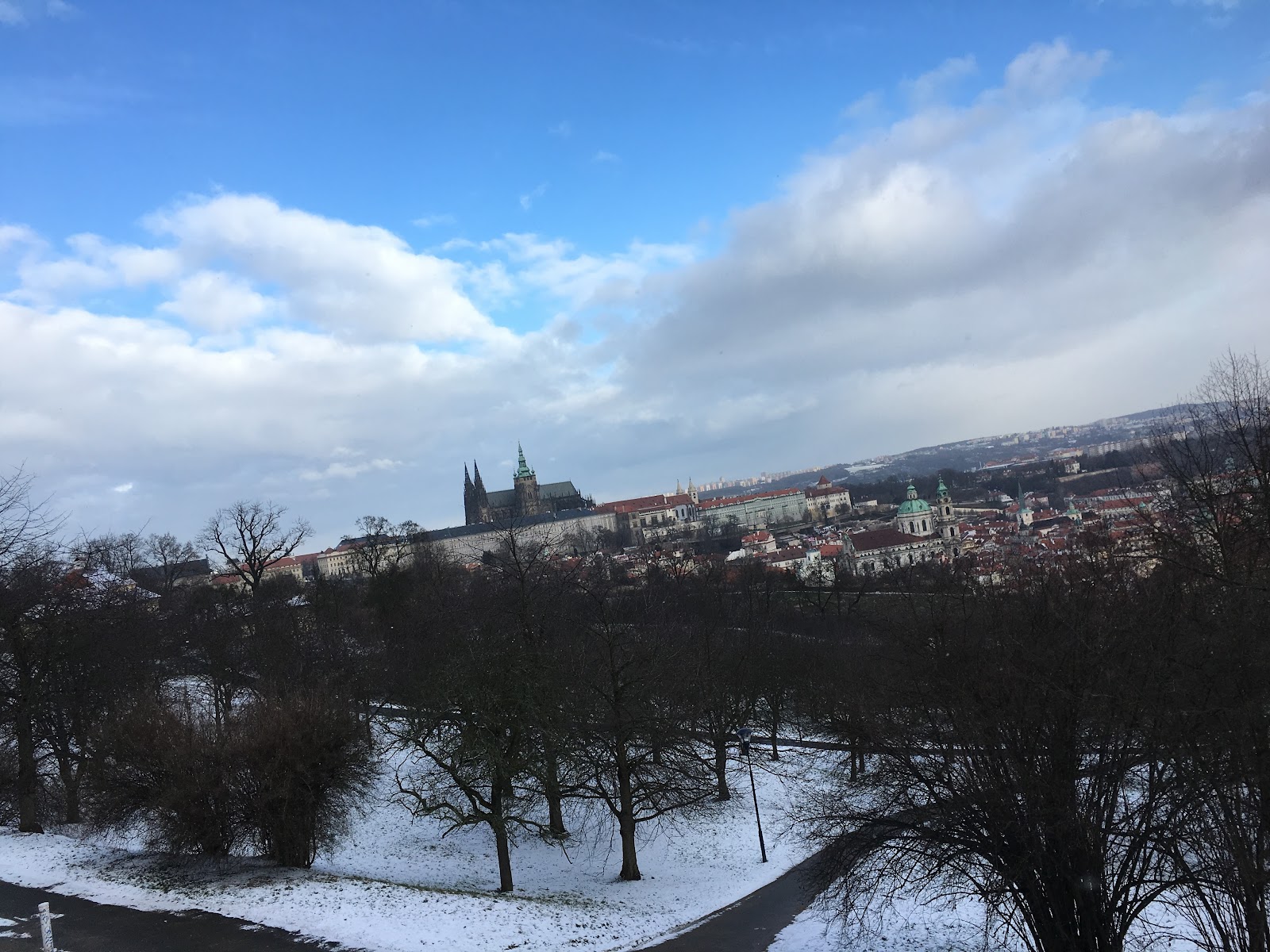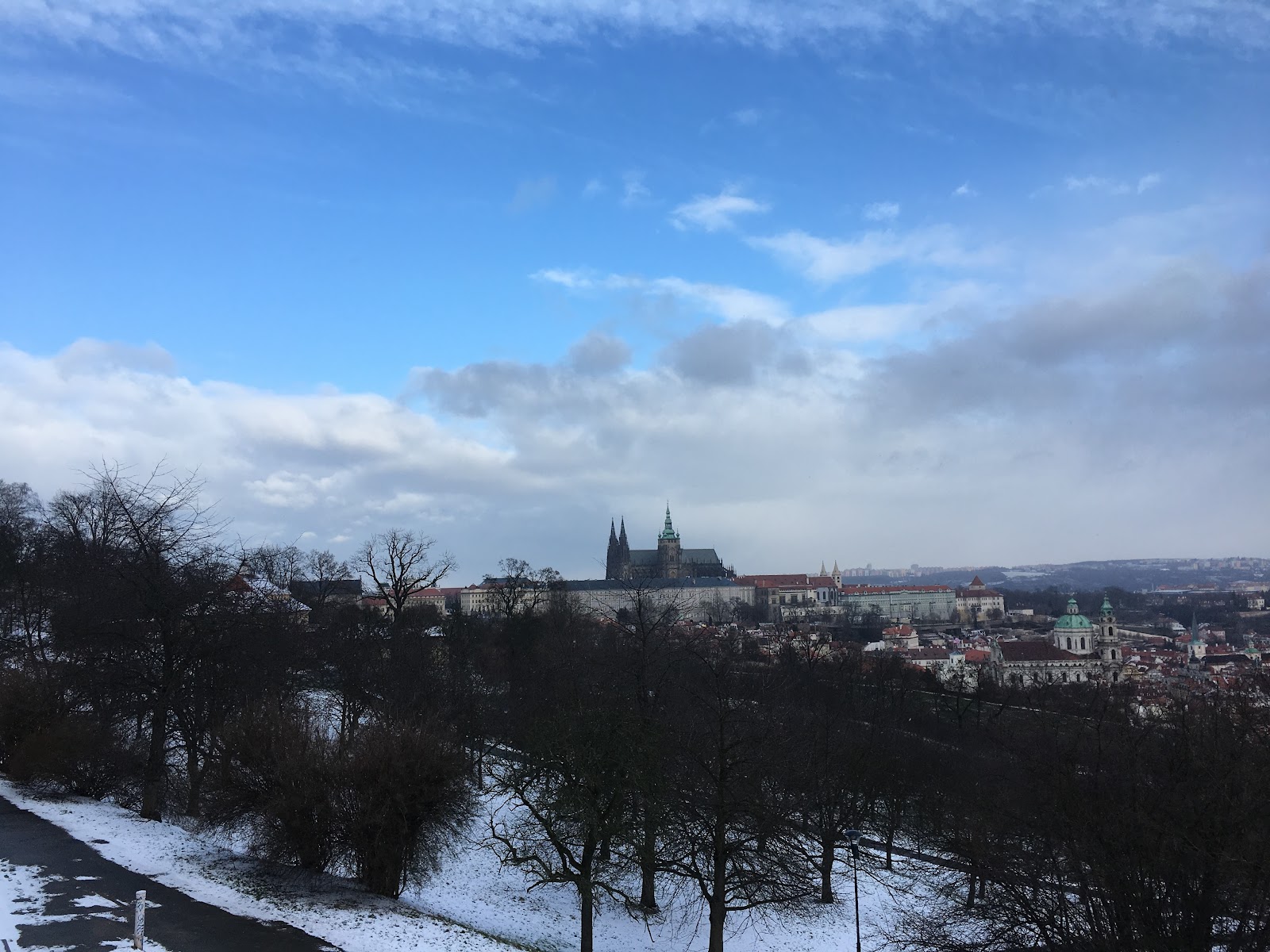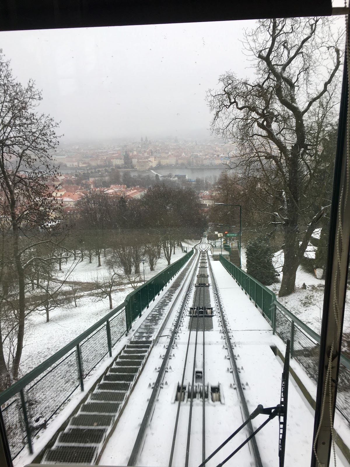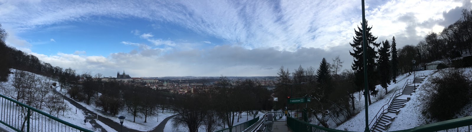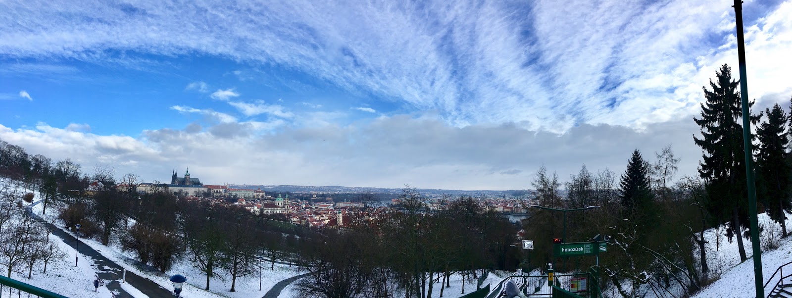 一出門遇到房東,說要開車出門,就直接載我們到我們要去的佩特任山,而且呢,到了就開始飄大雪,就是我想看到的白色世界的城市啊